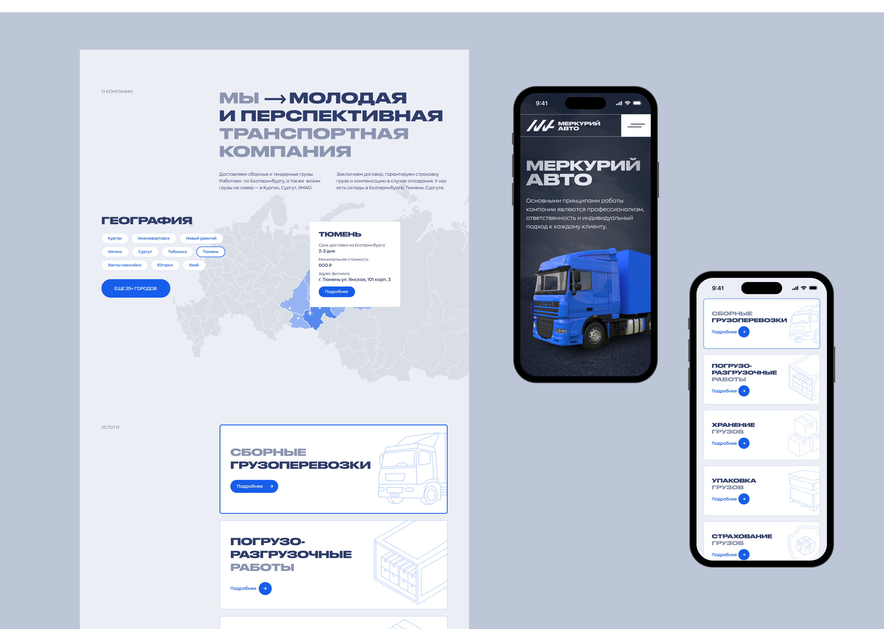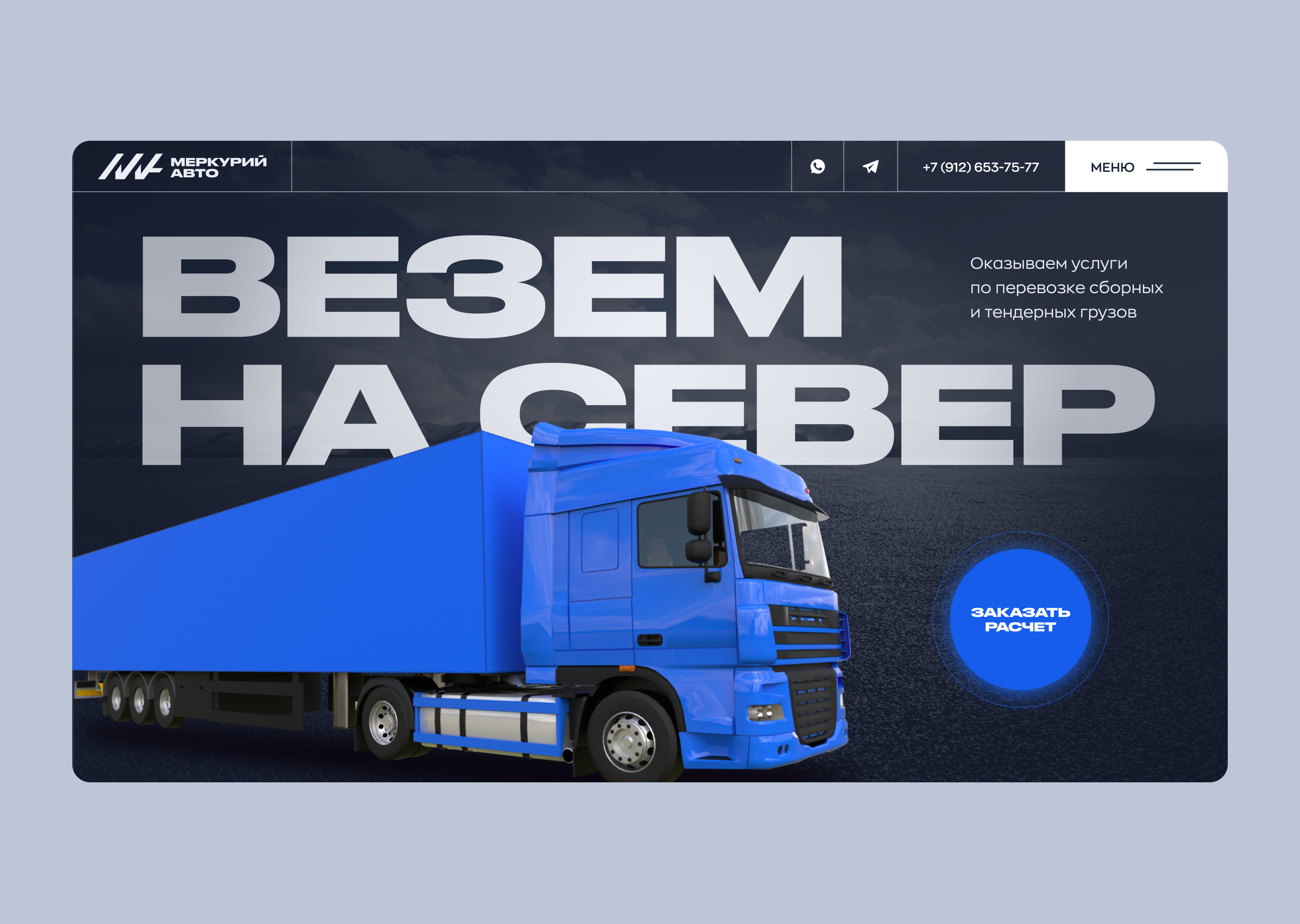 Выбрали основной цвет синий — ультрамариновый поцелуй сетчатки. Строгий, но яркий, как сама компания «Меркурий-Авто»“. Фоново серо-голубой, чтобы не забывали про холодные серые зимы и трудности доставки грузов на север.